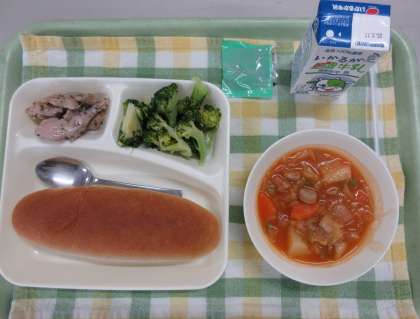 今日の給食は、鶏肉のバジル焼き・ウインナーと野菜のケチャップ煮・ブロッコリーのサラダ・パン・牛乳です。