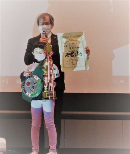 校長先生のお話の後、空手の組手全国大会で優勝した1年生の表彰伝達がありました。