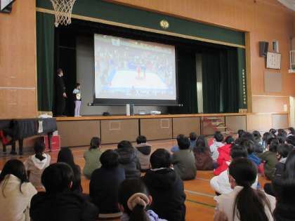 全国大会で頑張りのようすを上映し、全校児童で観ました。