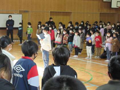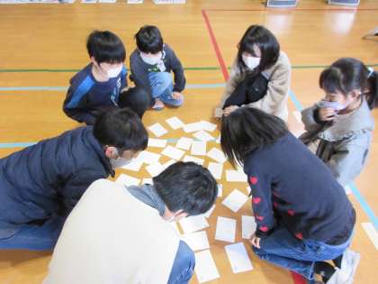 児童代表のはじめの言葉の後は、1年間一緒に活動したたて割り班で「カルタ大会」をしました。