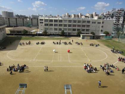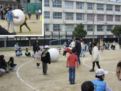 はじめにたて割り班対抗で「大玉転がし」をしました。運動会の全校競技でもしたことがあったので、慣れた様子ですいすい玉を転がしていました。