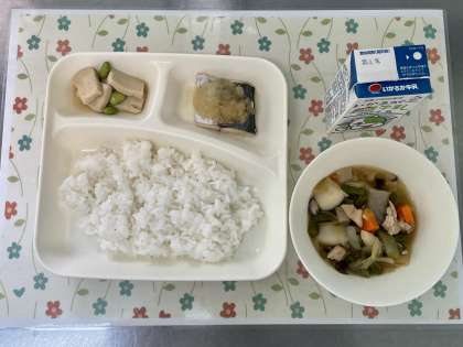 今日の献立は、さごしのおろしじょうゆかけ・さといもと野菜の含め煮・高野どうふの煮もの・ごはん・牛乳です。