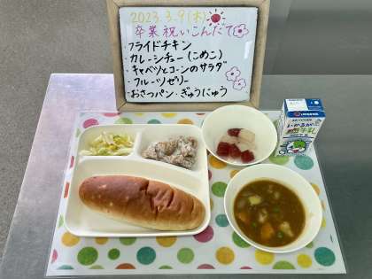 今日の給食は、卒業祝い献立でした。普段の献立よりも品数も多く、みんなが大好きな献立をたくさん組み合わせていました。