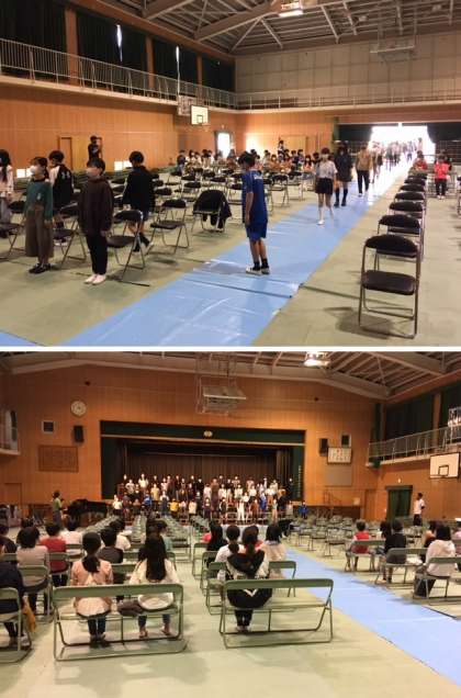 卒業式を1週間後にひかえて、今日は初めて卒業生(6年生)と5年生が合同で卒業式の練習をしました。