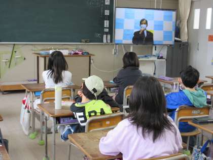 今日は、朝から雨が降っていて運動場の地面が濡れていたので久しぶりのテレビ放送で児童朝会を行いました。