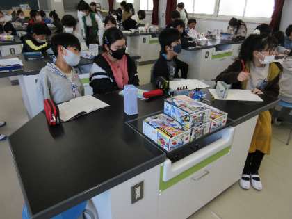 5年2組は理科室で、「電流のはたらき」の学習で使う教材のモーターで動く車づくりをしました。制作を楽しみにしている様子が伝わってきます。