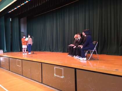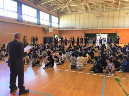 着任式では、2〜6年生児童が新しい先生方を「よろしくお願いします」と大きなあいさつで迎えました。