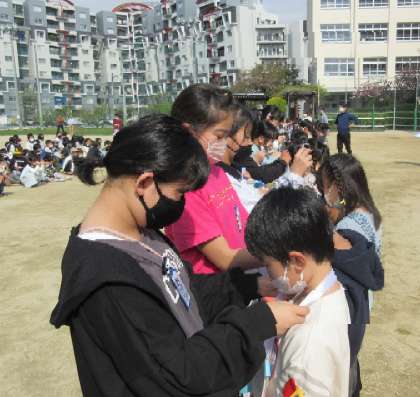 全員で学校についてのクイズをして楽しみました。新1年生は6年生から手作りのメダルをもらってうれしそうに教室へ戻っていきました。
