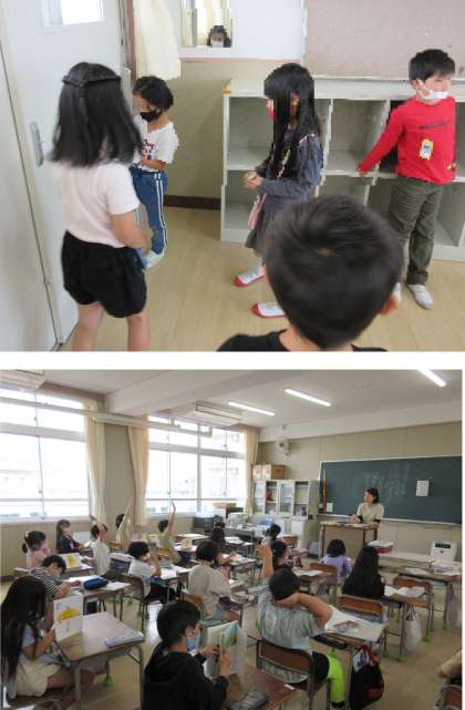 (4−2)国語の教科書を開いて、先生の質問に元気に答えていました。。