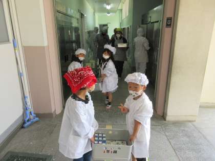 みんなで準備をし、給食当番の練習として今日は4名の児童が牛乳運びをしました。