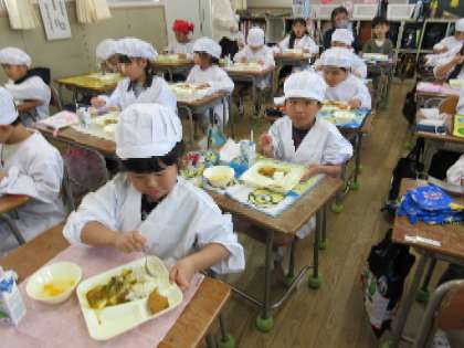 初めての給食をとてもおいしそうに、にこにこ笑顔で食べることができました。