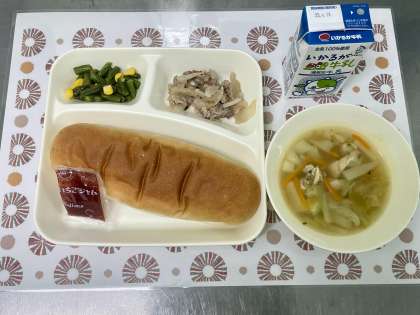 今日の献立は、豚肉のガーリック焼き・スープ・さんどまめとコーンのサラダ・大型コッペパン・いちごジャム・牛乳です。
