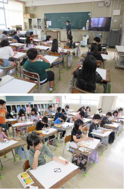 ↑3年生は図工の「三角形をつなげよう」のテーマで、線を丁寧に描いて三角形をつなげていく学習をしていました。