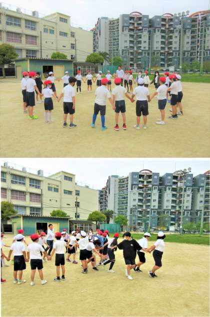 ↓5年2組は一週間の締めくくりを運動場でしていました。「全員なべなべそこぬけ」などのアクティビティを楽しんでいました。