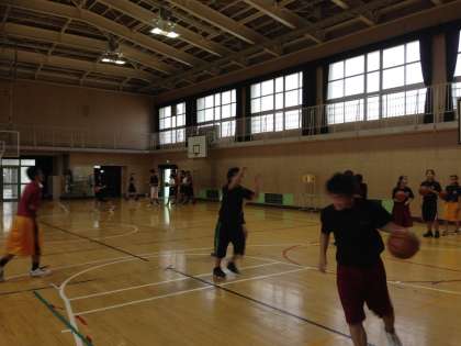 男子バスケットボール部と女子バスケットボール部は準備体操の後、パスやシュート練習をしました。