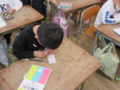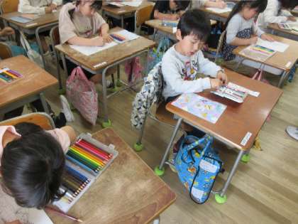 1年生の教室では、日直さんの名札として使う紙に、自分ですきな絵や模様を描いて色を塗っていました。