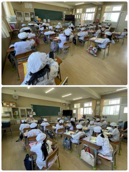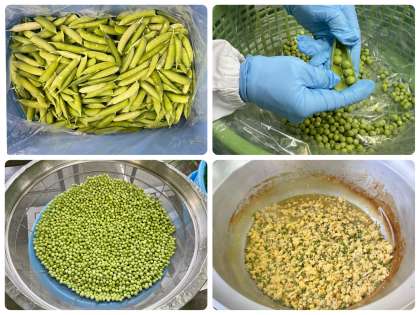 今日は、給食室でさやから取り出した生のえんどうを使っています。