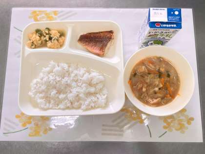 今日の献立は、あかうおのしょうゆだれかけ・みそ汁・えんどうの卵とじ・ごはん・牛乳です。