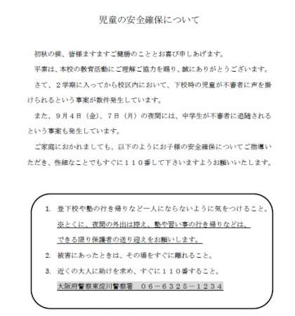 昨日(9月8日)午後、校区に不審者が出没しました。