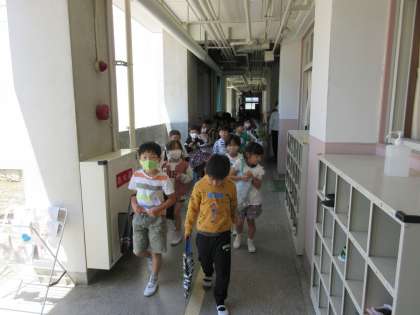 写真上:2年生は先生の先導なしで、自分たちで図書室にかしこく移動しています。