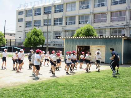 写真下:6年生は、速く走るために「腕ふり足上げ」の猛特訓中です。