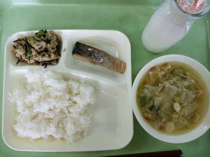 米飯・牛乳・さけのてり焼き・五目汁・高野どうふのいり煮です。