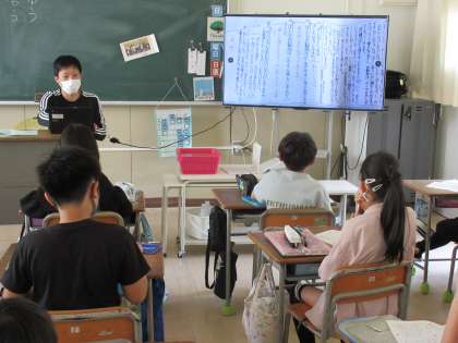 5年2組では、国語のテストの答え合わせで、正解を黒板に書かずに、正解が書かれたテストの画像をモニターに提示していました。正解を全て黒板に書くと、貴重な学習時間をたくさん使うので、いい工夫だなと感じました。