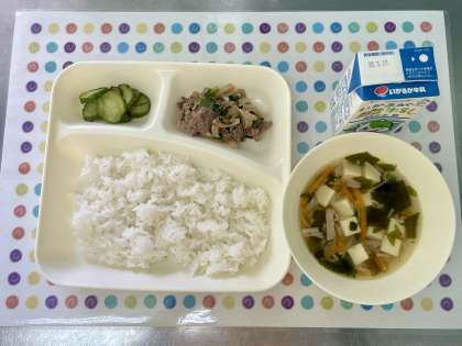 今日の献立は、プルコギ・とうふとわかめのスープ・きゅうりの甘酢づけ・ごはん・牛乳です。