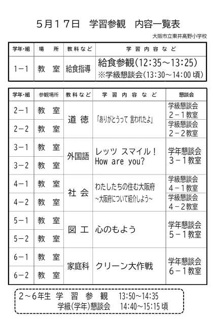 ※学習参観、懇談会の場所・内容につきましては下記の通りです。