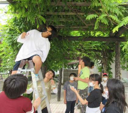 なかよし前のパーゴラには藤が植わっていますが、例年花があまり咲かない状態が続いていました。そこで、栽培委員会が「藤棚再生プロジェクト」を始動し、美しい花が咲く藤棚づくりに取り組み始めました。今日は、種が入った藤の実を取っていました。