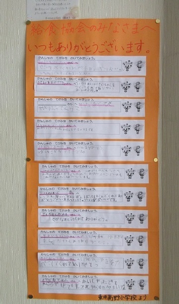 去年の1年生の児童が、栄養教育推進事業の「給食ができるまで」を学習した際に、野菜を育てている人、魚をとる人、食べ物を運ぶ人たちに向けてお手紙を送りました。