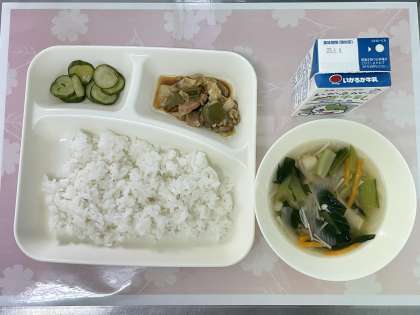 今日の献立は、ホイコウロー・中華スープ・きゅうりのピリ辛あえ・ごはん・牛乳です。