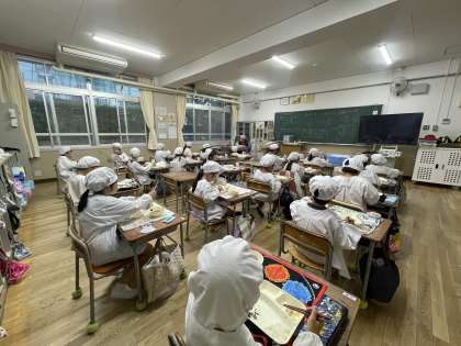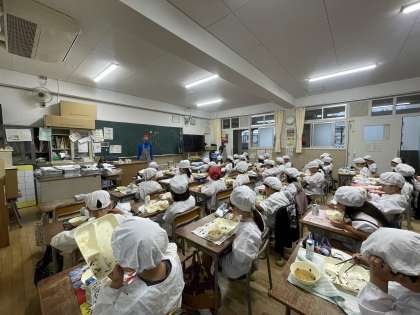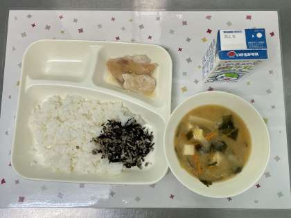 今日の献立は、鶏肉のおろしじょうゆかけ・みそ汁・魚ひじきそぼろ・ごはん・牛乳です。