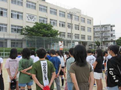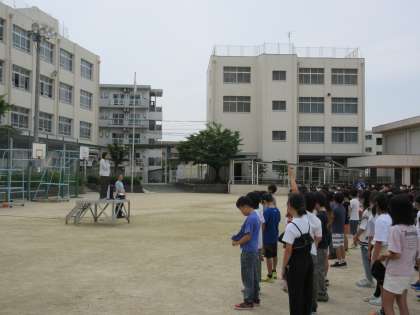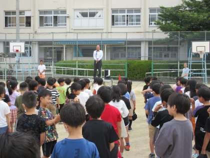 今朝は、2週間ぶりに運動場での児童朝会でした。