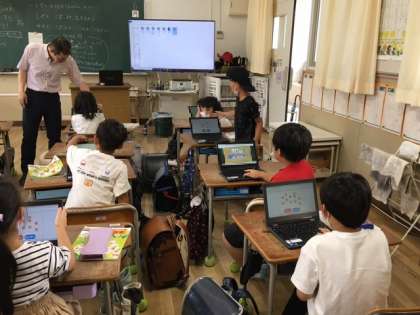 2年生は一人一台端末を使って、音楽の学習をすすめていました。プログラミングソフトを使って、楽譜を完成させ、メロディーを再生していました。