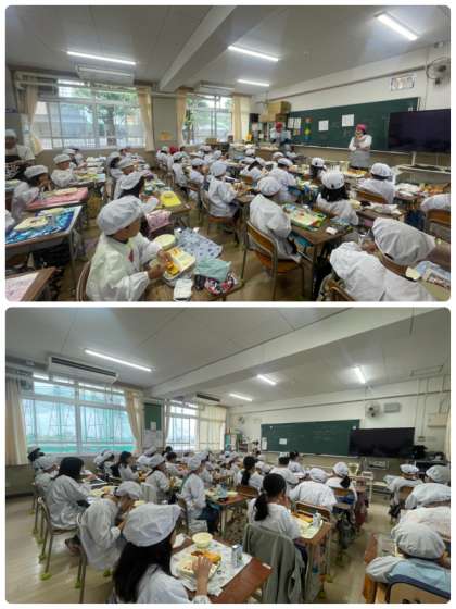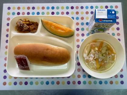 今日の献立は、かぼちゃのミートグラタン・鶏肉と野菜のスープ・クインシーメロン・大型コッペパン・いちごジャム・牛乳です。