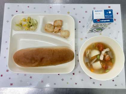 今日の献立は、いかてんぷら・フレッシュトマトのスープ煮・キャベツとコーンのソテー・黒糖パン・牛乳です。