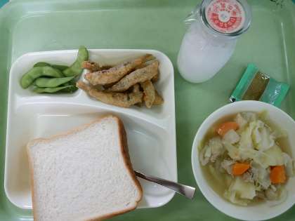 パン・りんごジャム・牛乳・いわしのてんぷら・じゃがいものスープ煮・枝豆です。