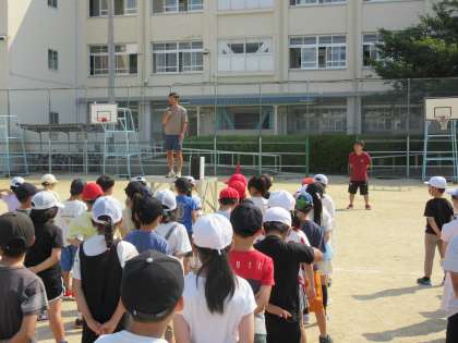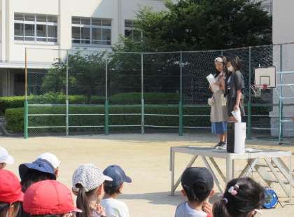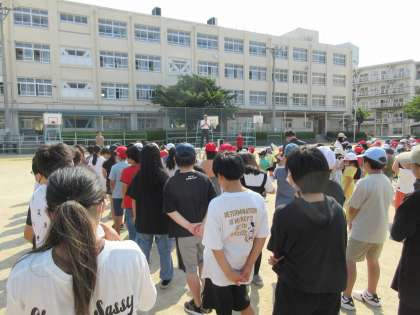 今朝は運動場での児童朝会でした。そろそろ朝の運動場も夏の日差しを感じます。