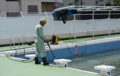 プールでは来週のプール開きに向けて、高圧洗浄機で汚れの目立つところを洗浄しています。プール全体は木曜日に教職員で清掃と準備を行う予定です。