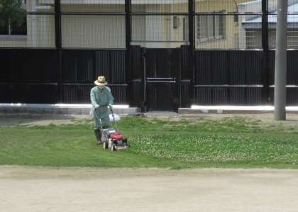 運動場では、伸びたシロツメクサと芝生を、機械を使って刈っています。とてもきれいに仕上がって、子どもたちも気持ちよさそうに遊んでいました。