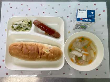 今日の献立は、ウインナーのケチャップソース・スープ・キャベツとさんどまめのサラダ・おさつパン・牛乳です。