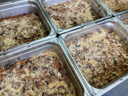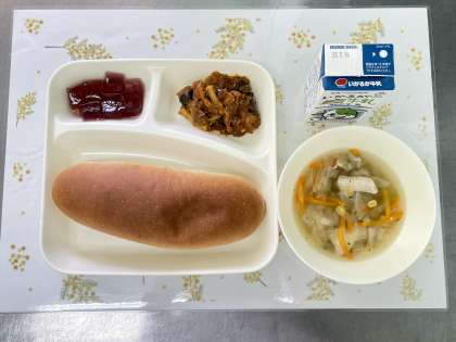 今日の献立は、なすのミートグラタン・スープ・ぶどうゼリー・黒糖パン・牛乳です。