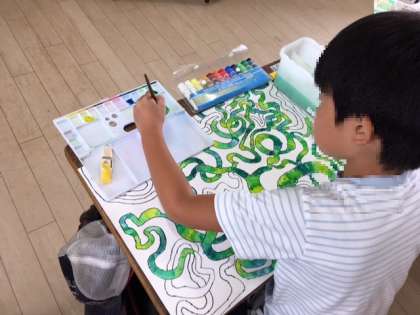4年2組の教室では、図工の絵の仕上げを集中して描いていました。