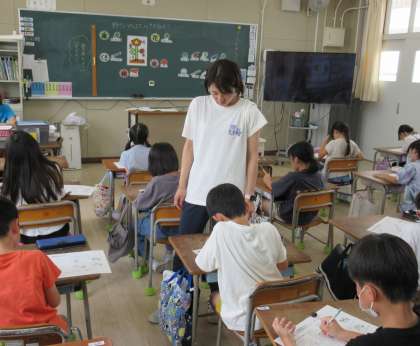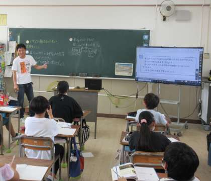 5年2組…1学期最後の算数は「わくわく算数ランド」で締めくくりです。先生もカメラに思わずポーズです。