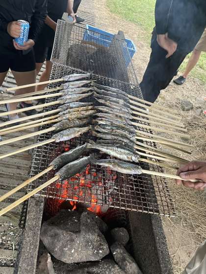 男女ともにみなで協力し、おいしい魚にたどりついたようです。