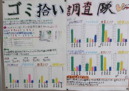 壁新聞では、この夏休みに5日間、6年生が自主的に井高野公園の清掃をして分かったことがしっかりとまとめられていました。