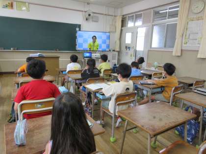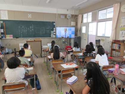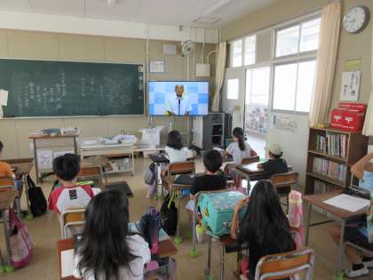 本日も外は蒸し暑いコンディションのため、テレビ放送で児童朝会を行いました。