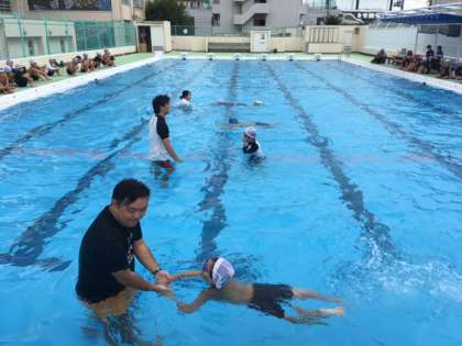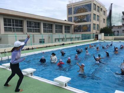 2年生は水に入ると、「2年生名物?エビカニクス」で水慣れです。そのあとは水に浮かぶ練習です。2人→4人と手をつないで浮かんでいきました。