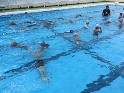 今日のメインは「ふしうきバタ足で遠くまで進もう!」でした。記録をとる前に、ほぼマンツーマンで指導を受け、コツを伝授してもらっていました。